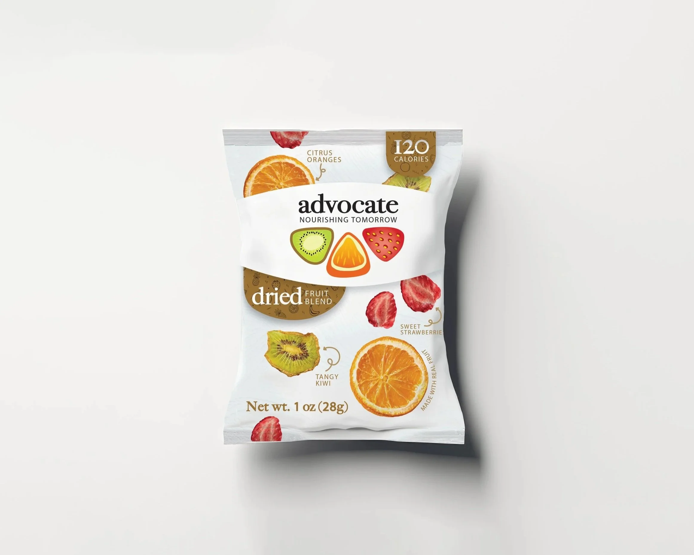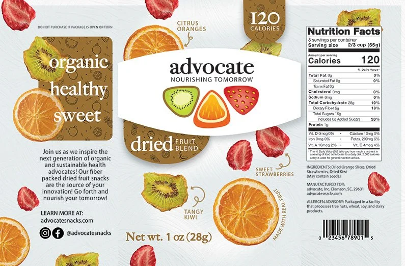 This project involved creating a full brand identity and package design for Advocate, a fictional food company centered on inspiring the next generation of sustainable food advocates. I developed the logo, visual language, and snack packaging for their line of dried fruit blend packs.
